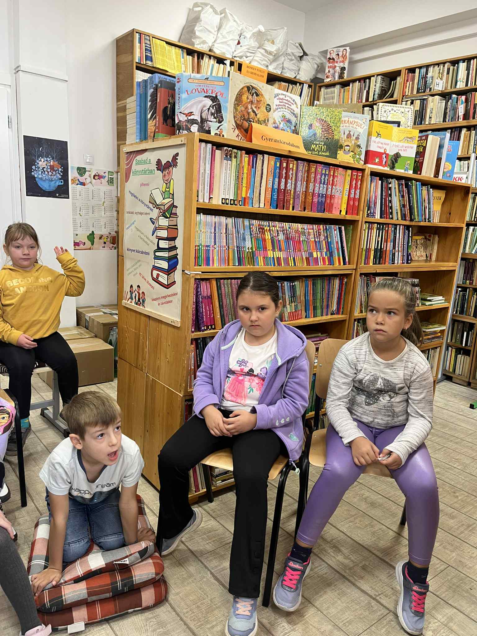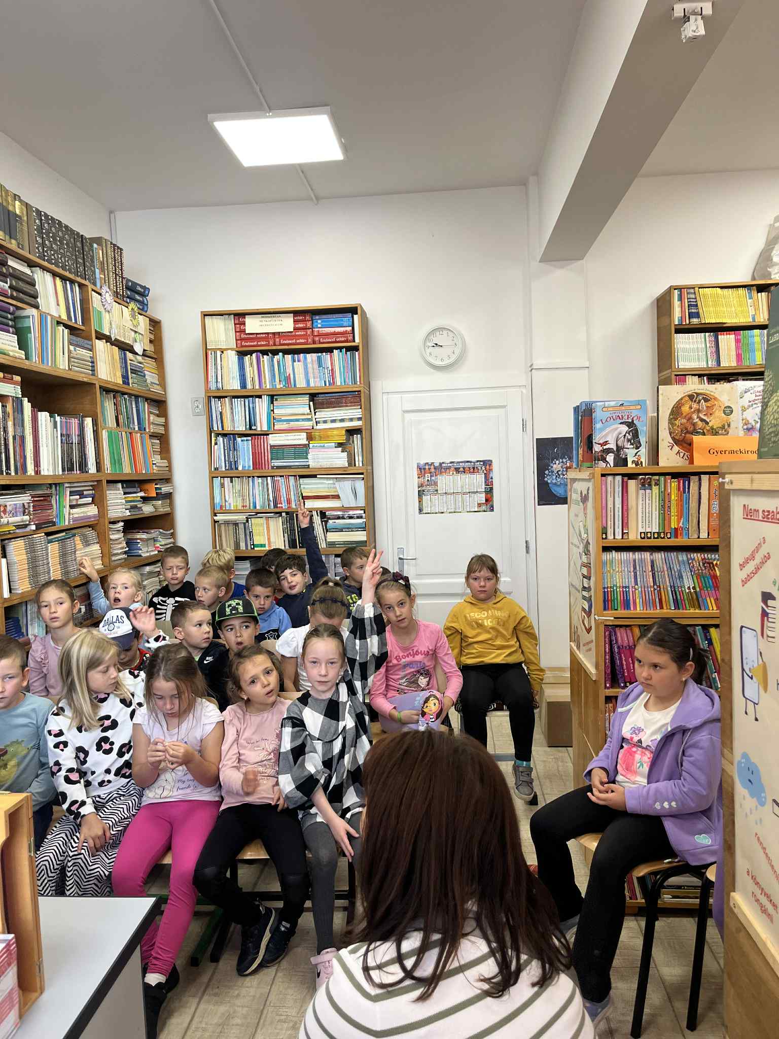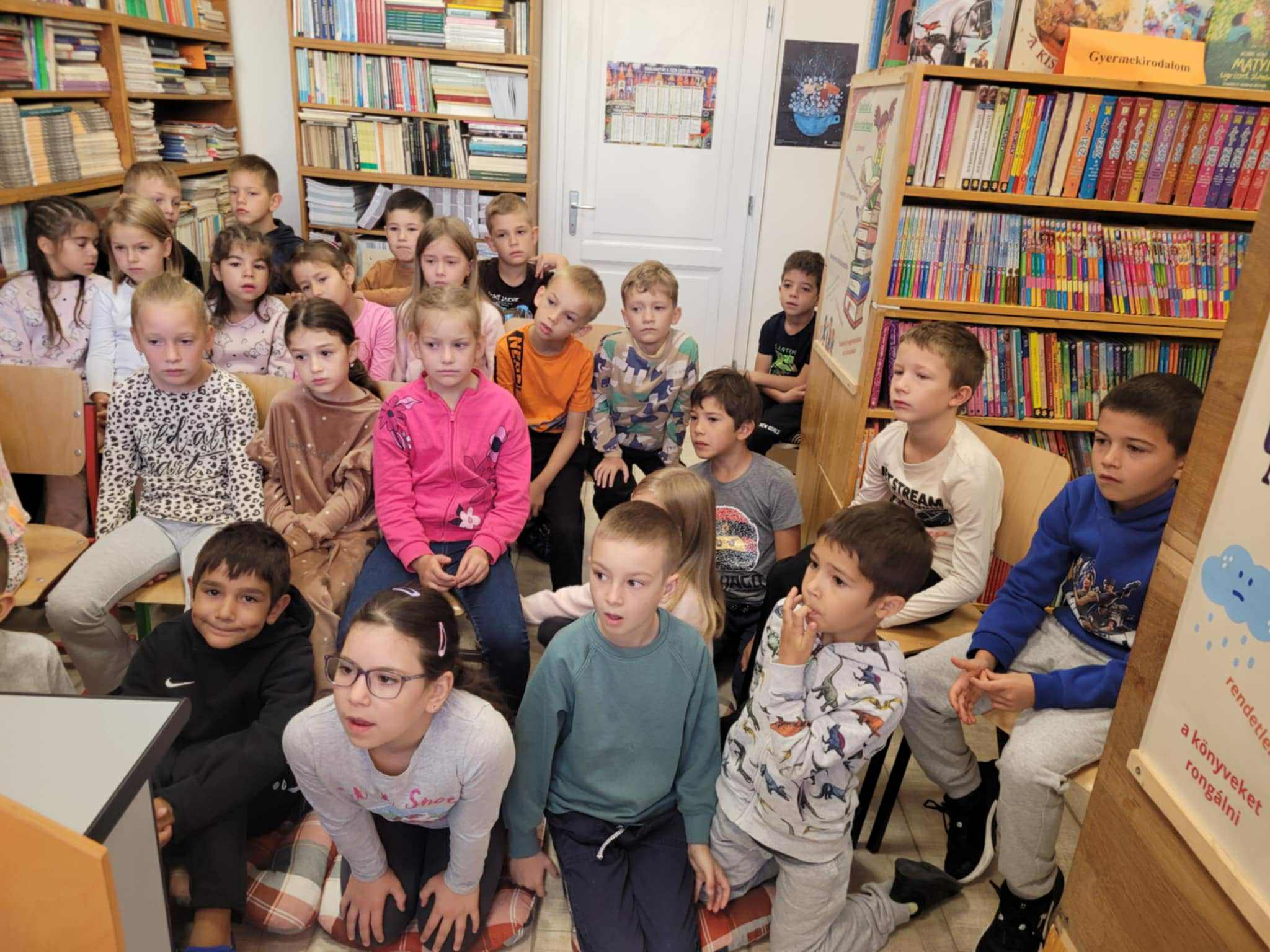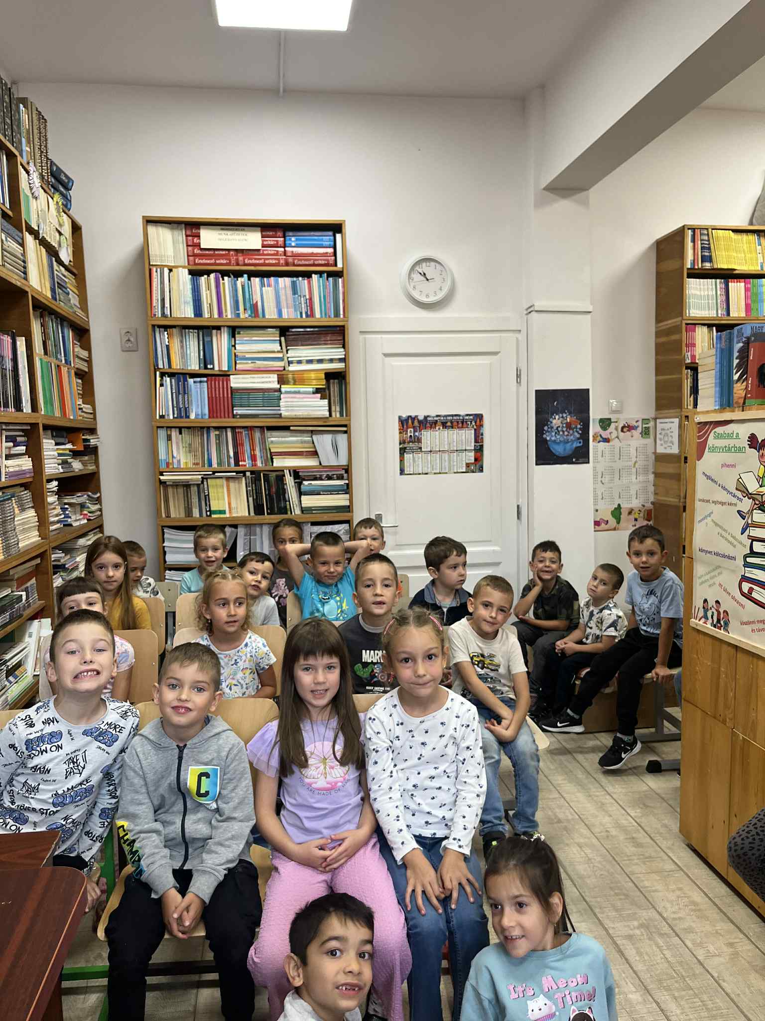 Csütörtökön az elsősök vették birtokba a könyvtárat. Az egyik osztály Benedek Elek A kerek kő című meséjét hallgatta meg, majd beszélgettek is „Elek apóról”, akinek házát előző nap láthatták. Egy másik osztály szintén a Hogyan nőtt nagyra az ég című mesét élvezhette a papírszínház varázsában.